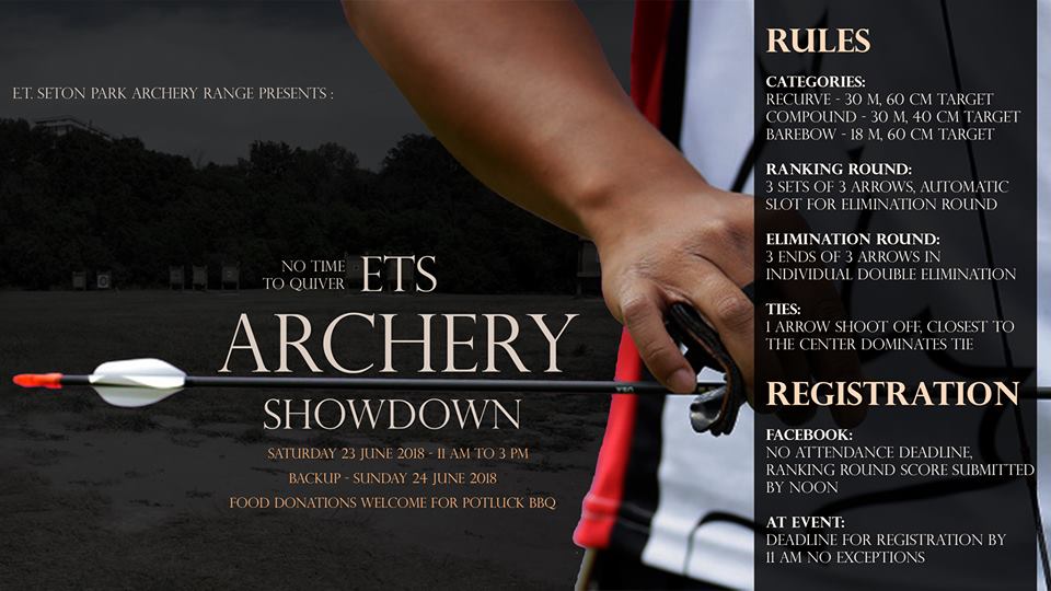 Coming up on June 23rd is the 2018 Seton Archery Competition (aka, the ETS Archery Showdown). Participants should show up early or on time if they wish to take part. No exceptions. Be on time or early. The competition is free and there is a Potluck BBQ.